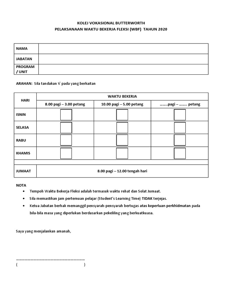 Surat Pekeliling Am Bil11 Tahun 1981 Sistem Penggunaan Kad Perakam Waktu Punch Card di. Menurut Ketua Pengarah Jabatan Perkhidmatan Awam JPA Datuk Seri Borhan Dolah langkah itu bertujuan menyeimbangkan masa bekerja dan masa bersama keluarga. Berikut adalah jadual Waktu Bekerja Fleksi WBF bagi kakitangan awam Mulai 1 Mac 2019.